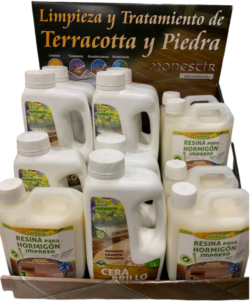 - Resina para hormigón impreso: Resina en base agua que protege sus suelos contra todo tipo de manchas domésticas. Realza la coloración natural del pavimento. Evita la aparición de eflorescencias salinas y manchas de humedad. Actúa como consolidante. Protege sus suelos contra las inclemencias atmosféricas. Evita el desgaste y envejicimento prematura.